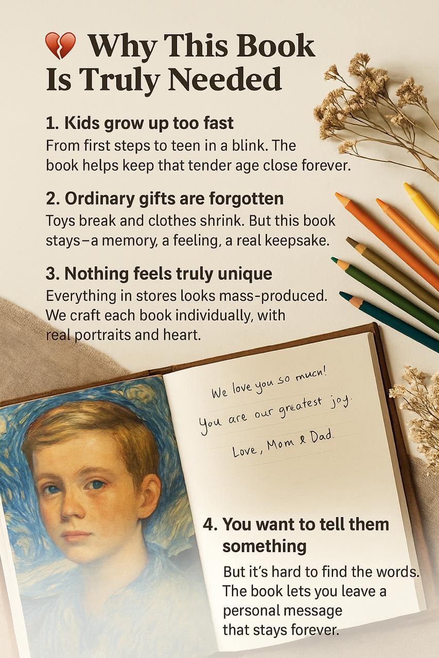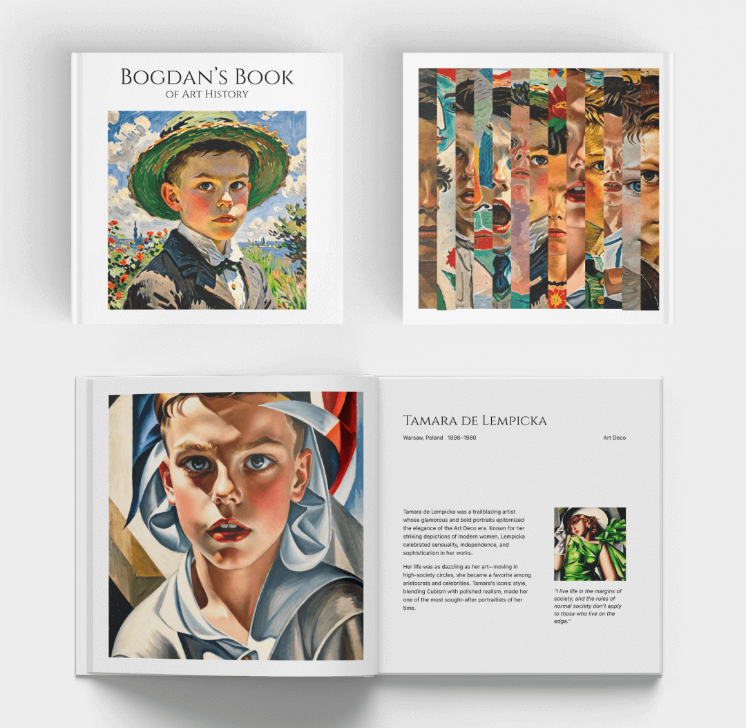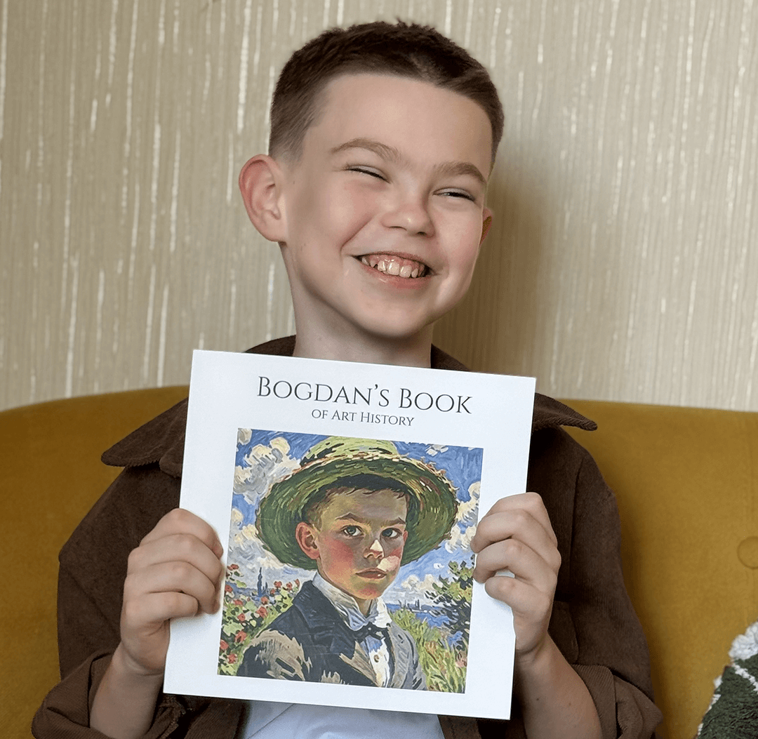 We gave this book to our grandson for Christmas, and it was hands down the best reaction of the night. As soon as he saw himself in the artwork, he gasped and ran to show everyone in the family. He kept asking how they turned him into a real painting! It sparked so much curiosity and excitement—he even wanted to learn more about the original artists. The quality is outstanding, and the concept is truly one-of-a-kind. If you’re looking for a meaningful and unforgettable gift, this is it!